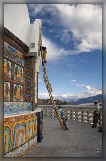 On charge les bagages sur le toit d’un minibus qui nous amène à la guest house « Lamo » accueillis par les incontournables « Juley » et les grands sourires de Lamo et ses deux filles. Un thé, quelques biscuits et au lit. Targes viendra nous chercher vers 16h00 pour un petit entrainement… La montée des escaliers qui mènent au stupa nous fait vite comprendre que l’air est gratuit, mais rare.