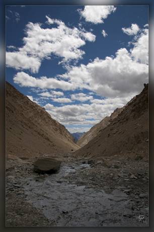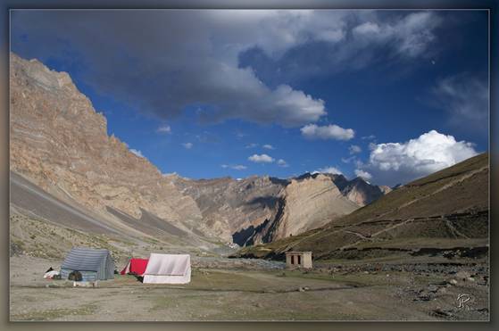 Nous récupérons Gurung le cuisinier Népalais et Norbhu l’aide de cuisine, chargeons le matériel et les vivres pour les dix jours de trek et partons sur les routes pittoresques du Ladhak et du Zanskar. Les premiers kilomètres se font sur une route large et goudronnée mais très rapidement les dégâts dus aux inondations de l’an passé nous font comprendre que le trajet va plus tenir du safari tout terrain que de la balade sur autoroute. De nombreux chantiers interrompent la progression et la patience devient vite la vertu première du trekkeur. Après 6 heures de chaos Photoskar est en vue. Le premier camp est installé près d’un point d’eau, avec le village en décor de fond. Le horse man nous a rejoints avec sa caravane de 9 ânes qui seront nos porteurs pour ces prochains jours. Les lumières du jour qui s’en va sont renversantes… et ce n’est que le début.