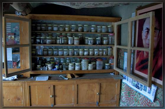 Le réveil est douloureux…: coliques néphrétiques ! Je n’ai jamais eu un truc pareillement douloureux.… Mais bon…… quand faut y aller… faut y aller…… Targes porte mon sac et en route. Le temps est incertain, mais la pluie s’est arrêtée. Le temps change aussi souvent au Zanskar que la mode à Paris. (proverbe Zanskari) Tant bien que mal (mais plutôt mal) on arrive à Linshed, après 4h d’une marche assez facile. Visite du monastère et petite séance de prière avec les moines. Le horse man a réussi à trouver l’Amshi (le médecin du village) qui me reçoit dans sa « clinic » au milieu de bocaux en verre contenant une multitude de poudres miraculeuses. Verdict : plus de toilette à l’eau froide, ne pas s’asseoir par terre et ne plus boire de liquide sucré. J’avale avec peine une cuillérée de poudre magique et vais me coucher. Vers 20h00 je suis réveillé par quelques chants et le bruit de la fermeture éclair de ma tente. Toute la caravane m’apporte un magnifique gâteau avec bougies. Je l’avais presque oublié … c’est mon anniversaire.