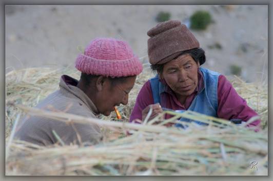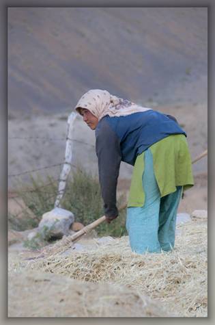 La descente continue jusqu’à un torrent que franchit un pont suspendu que nous empruntons. Commence une montée raide vers le Parfi La (3900 m). Campement au village de Hanumil (3600 m). A l’arrivée au village, (4 familles) les travaux des moissons vont bon train. Après quelques bières « Godfather » Laurette réalise un rêve qu’elle n’osait espérer, travailler avec les femmes Zanskaris, tout comme Marianne Chaud et Gilbert Montagné. Un grand moment de partage avec les villageoises.