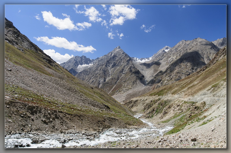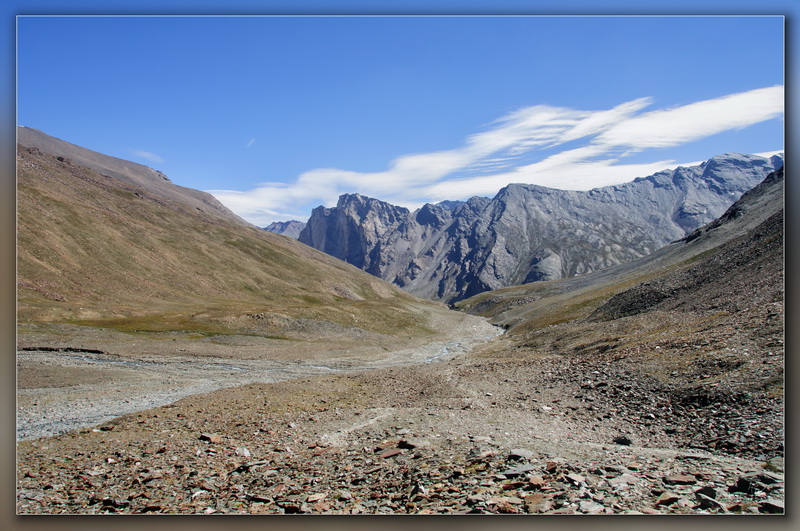 La première partie du parcours est relativement pentue durant une bonne heure puis se succèdent faux plats montants, franchissement de rivières et de névés pour arriver à la dernière montée dans un pierrier de type moraine bien casse pattes. Le sommet culminant à 5090 m est atteint sans trop souffrir, sauf pour Michelle qui y est arrivée à la force mentale. Petit moment d’émotion sur ce qui est désormais notre nouveau toit du monde… La descente sur Shumiknakpo est ponctuée de 3 franchissements de rivières aux débits forts respectables. Pour la première, on se mouille jusqu’aux cuisses dans de l’eau à 5°C max. Pour la deuxième, nos guides portent nos épouses sur le dos, les mecs se mouillent…