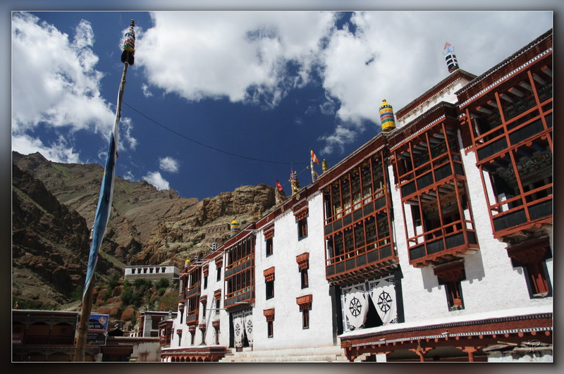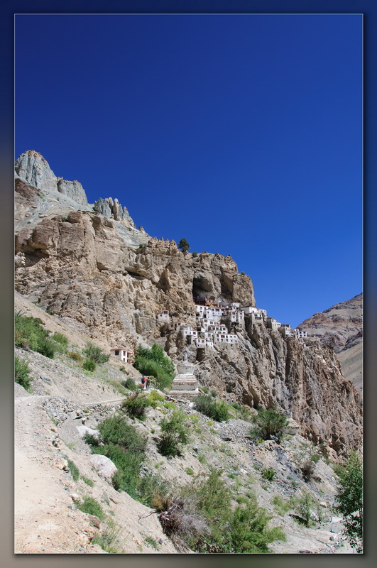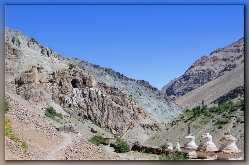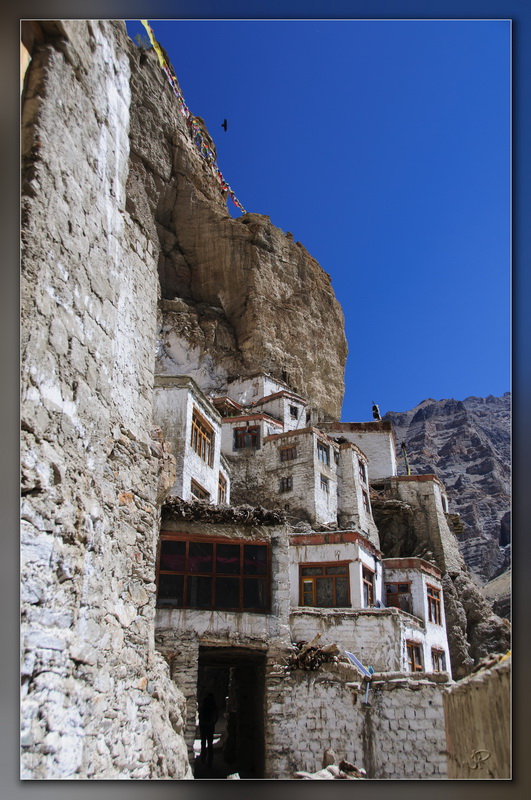 Aujourd'hui, un gros morceau ... le monastère de Phuktal, le plus connu et le plus ancien du Zanskar. Une cascade de petites constructions blanches qui semblent collées à la falaise entre ciel et rivière, ce "gompa" est le plus spectaculaire du Zanskar. Construit autour d'une grotte qui abrite une source sacrée ce monastère du XII°s accueille 80 moines de l'ordre Guélugpa, appelés aussi "bonnets jaunes". Autour du temple aux murs rouges s'accrochent les cellules blanches des moines.
