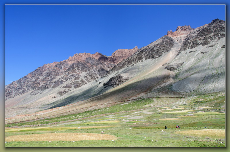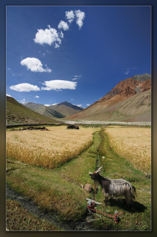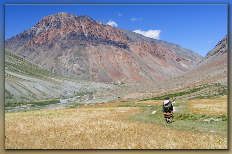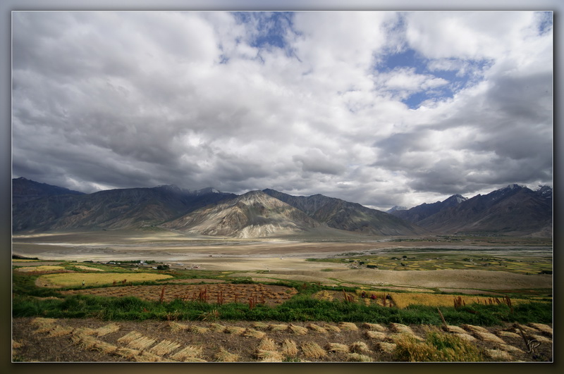 Un parcours qui débute par une montée abrupte de 40 minutes. Nous voila chauds pour la journée. La suite du trajet est un long faux plat montant vers le très joli village de Testa où nous sommes invités à partager un thé chez un ami de Kell. Un policier de Leh en vacances dans son village natal pour aider sa famille à préparer l'hiver. Récolte du seigle, des petits pois et de la bouse de yack séchée pour alimenter le seul fourneau de la maison servant au chauffage et à la cuisson.